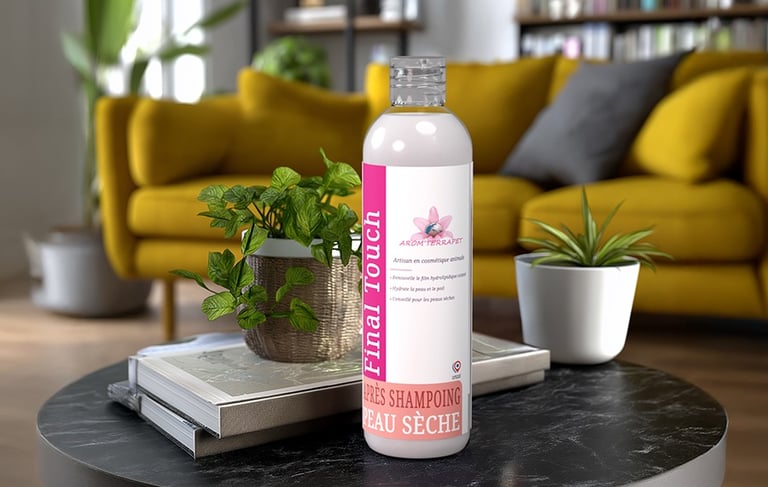 L’après-shampoing Final Touch est un soin à rincer, formulé avec des extraits de coco, babassu, macadamia et algue rouge, idéal pour les peaux sèches ou fragilisées. Utilisé dilué après le shampoing, il aide à restaurer le film hydrolipidique naturellement présent à la surface de la peau, souvent altéré par le lavage. Il laisse le poil souple, nourri et éclatant, tout en assurant une protection durable contre les agressions extérieures. Final Touch offre une finition soignée et respectueuse de l’équilibre cutané.